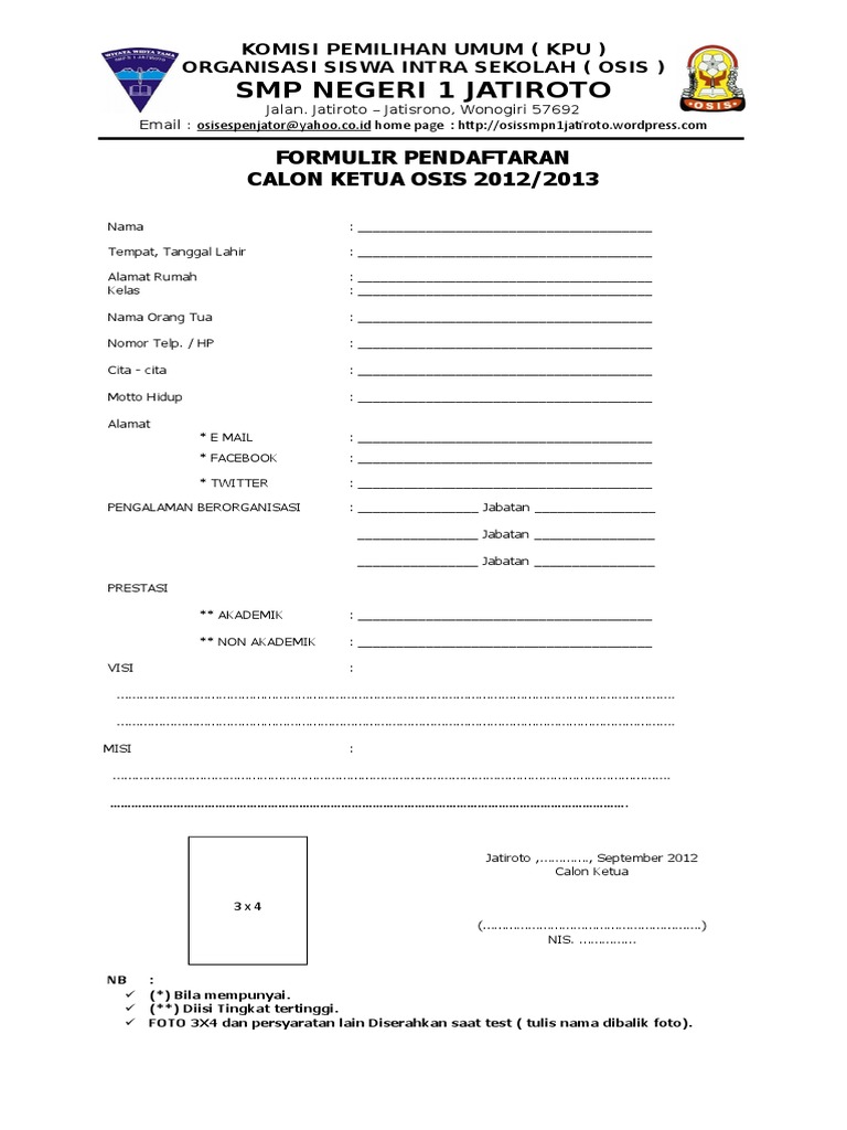 Contoh formulir pendaftaran calon ketua osis. Dalam pemilihan calon ketua osis tentunya harus ada peserta didik yang di calonkan untuk menjadi ketua osis dengan mengisi formulir pendaftaran. Contoh formulir pendaftaran calon ketua osis periode 20132014 smk karya nasional kuingan unknown 2013 09 25t064500 0700 50 stars based on 35 reviews komisi pemilihan umum kpu organisasi siswa intra sekolah osis smk karya nasional jl. Jika kamu terpilih sebagai ketua osis jelaskan tindakannmu jika kamu mengetahui ada siswa ikhwan dan akhwat pacaran.