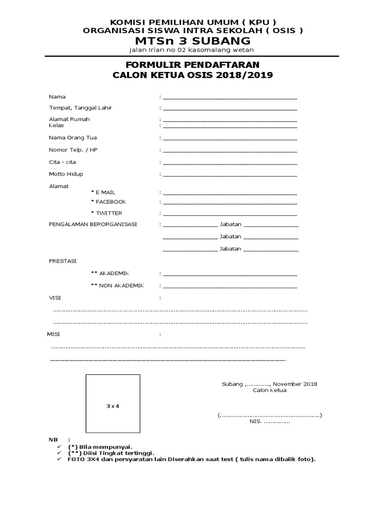 Formulir pendaftaran calon ketua dan wakil ketua osis sman pintar kuantan singingi periode 20122013 formulir pendaftaran. Jika anda sedang mencari formulir pendaftaran calon ketua osis terbaru berikut ini contoh formulir pendaftaran calon ketua osis terbaru 2018. Berdasarkan hal itu bagi anda yang ingin mengetahui bagaimana bentuk formulir pendaftaran calon ketua atau wakil ketua osis pada kesempatan ini kami membagikannya.