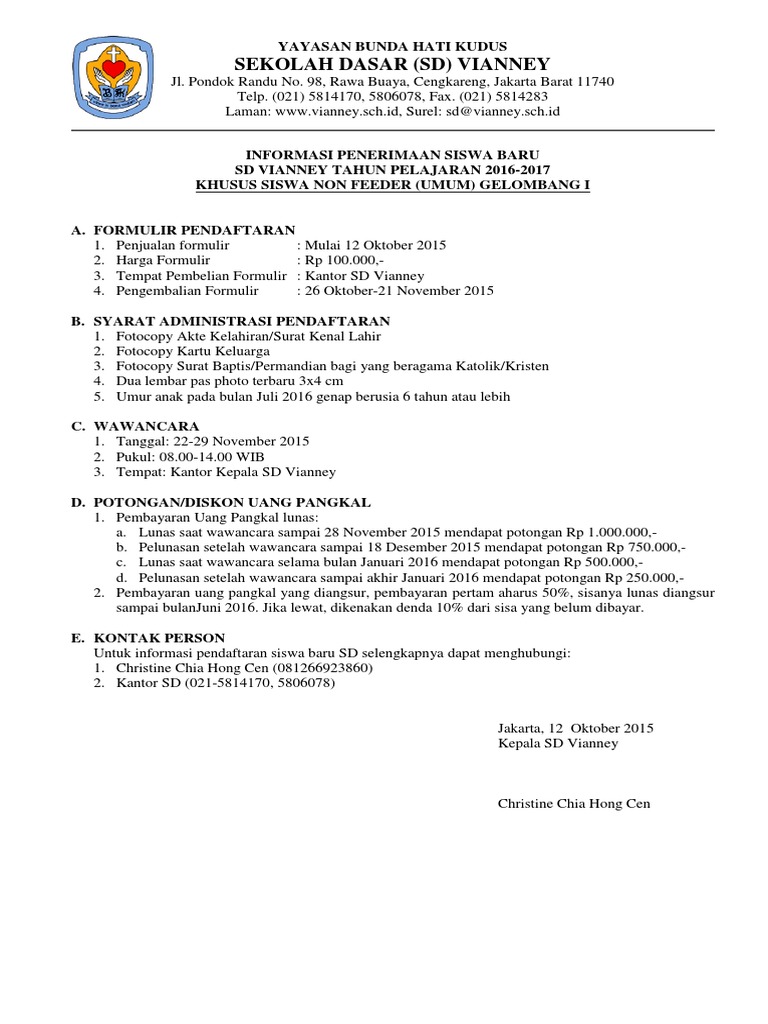 Penerimaan Siswa Baru Sd Vianney Tahun Pelajaran 2016 2017