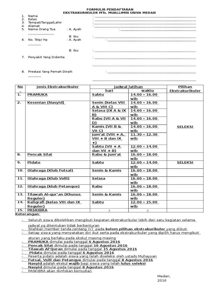 Ekskul dilaksanakan 3 kali dalam sepekan yaitu pada hari selasa kamis dan jumat. Formulir pendaftaran peserta didik baru smp al anwari 2013 download. Saya menyatakan untuk mengajukan diri sebagai calon anggota gugus depan ambalan cempaka putih 02001 02002.