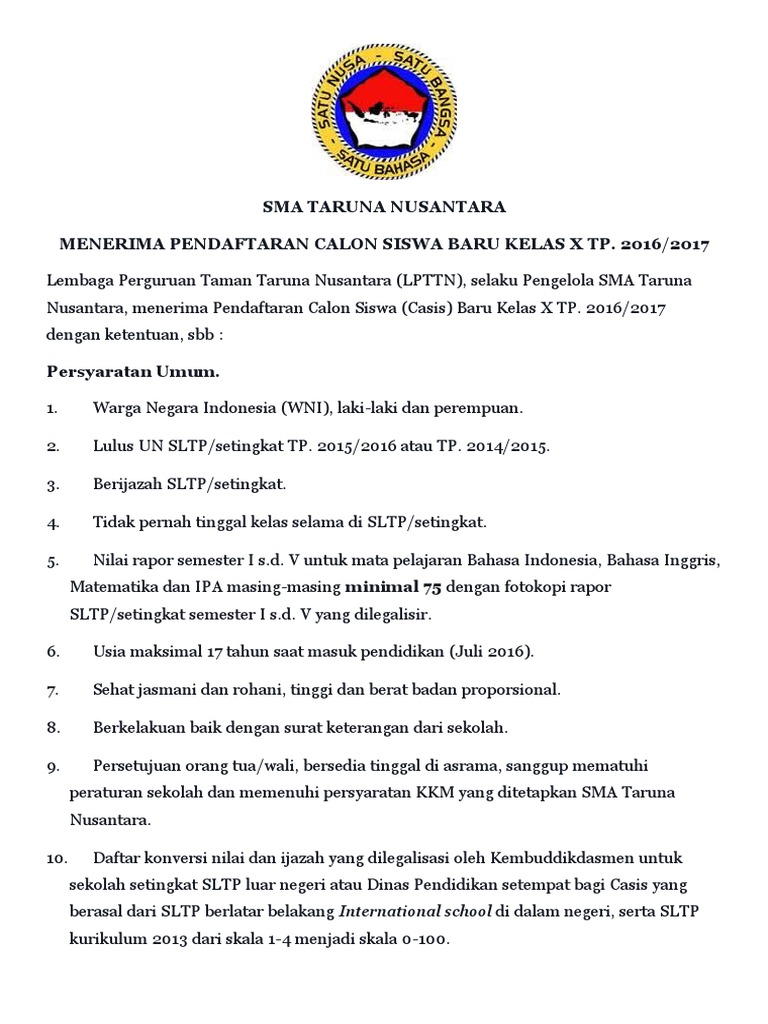 Syarat Pendaftaran Calon Siswa Baru Sma Taruna Nusantara Tp