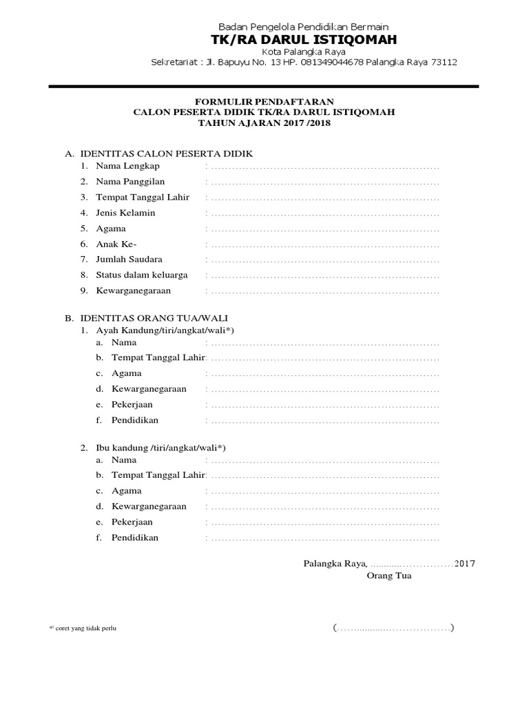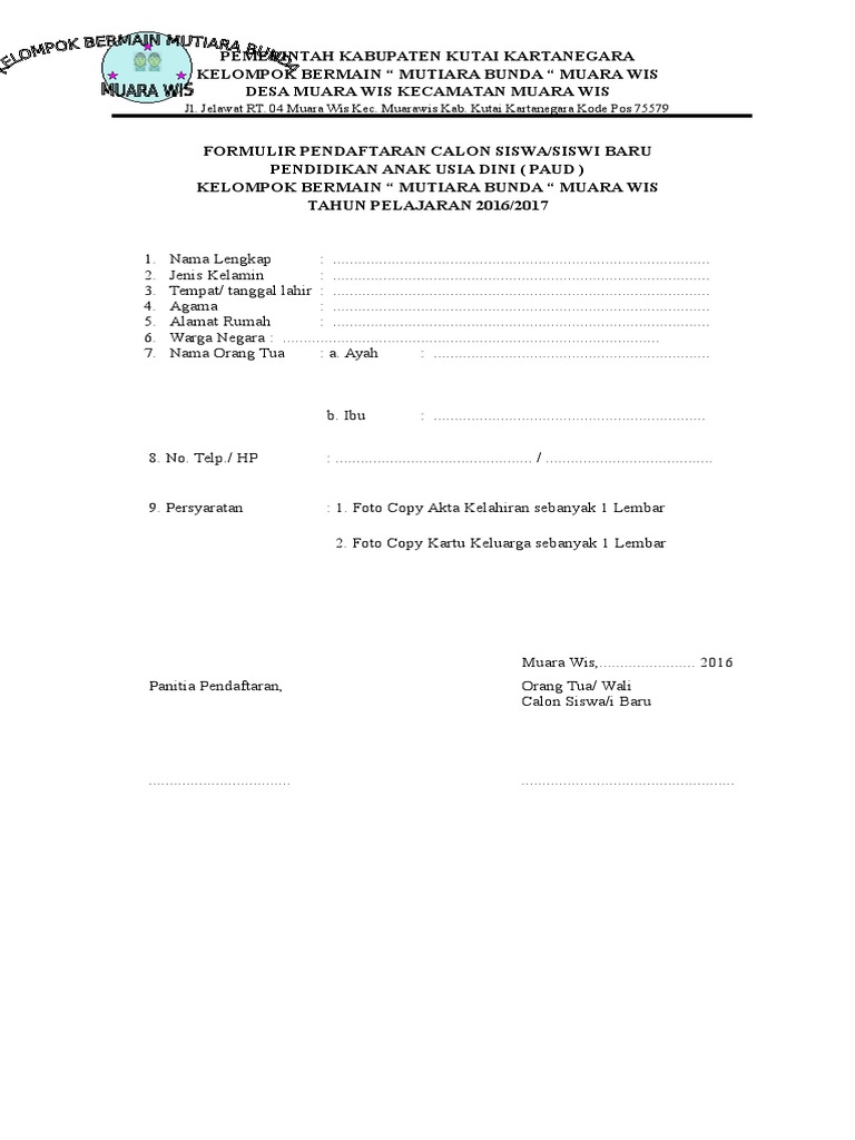 Contoh Formulir Pendaftaraan Siswa Baru Tk Paud Tahun 2018