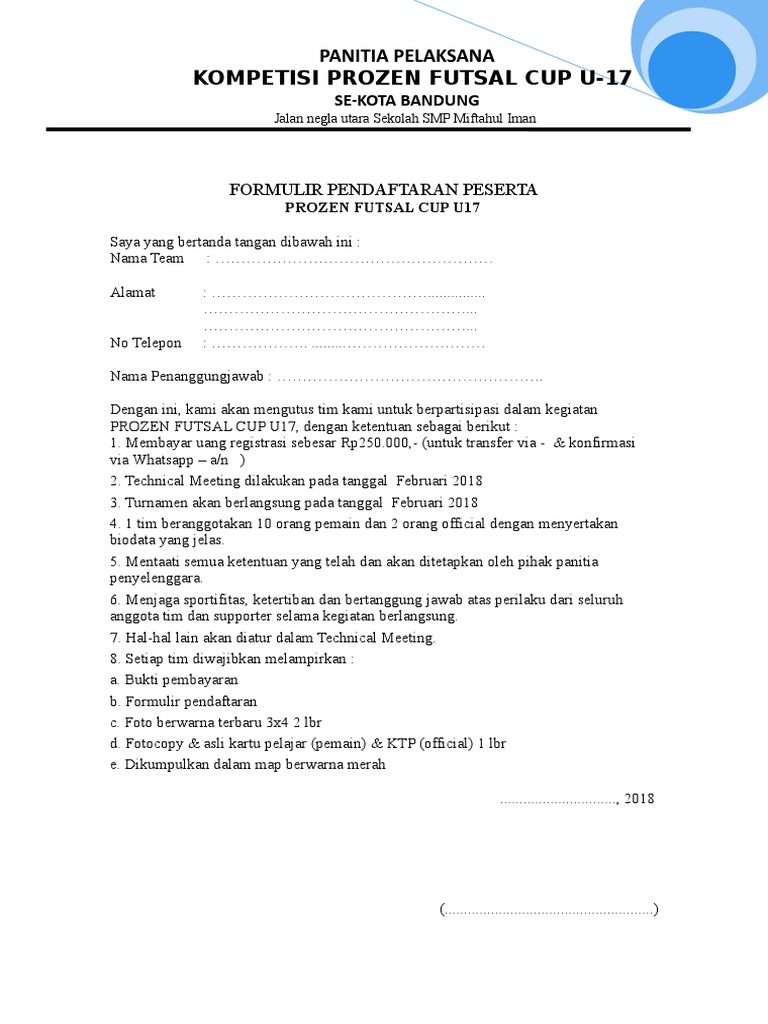 Contoh proposal turnamen futsal 2011 16 november 1 oktober 6. Sistem yang digunakan adalah sistem gugurknock out. Contoh formulir contoh formulir kesediaan contoh formulir bahasa inggris contoh formulir pendaftaran contoh formulir pembukaan rekening contoh formulir dalam bahasa inggris contoh formulir model c1 kwk plano contoh formulir registrasi contoh formulir bank contoh formulir pendaftaran sekolah contoh formulir pendaftaran organisasi pdf contoh formulir pendaftaran kerja.
