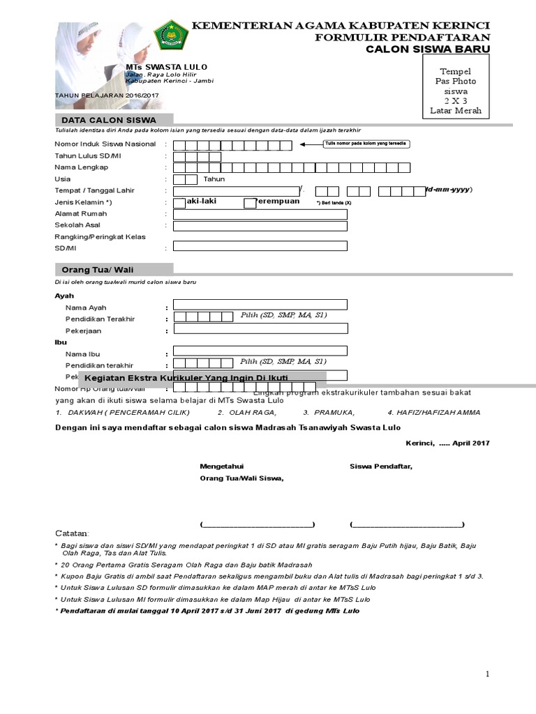 Contoh Formulir Pendaftaran Sekolah Mts Detil Gambar Online