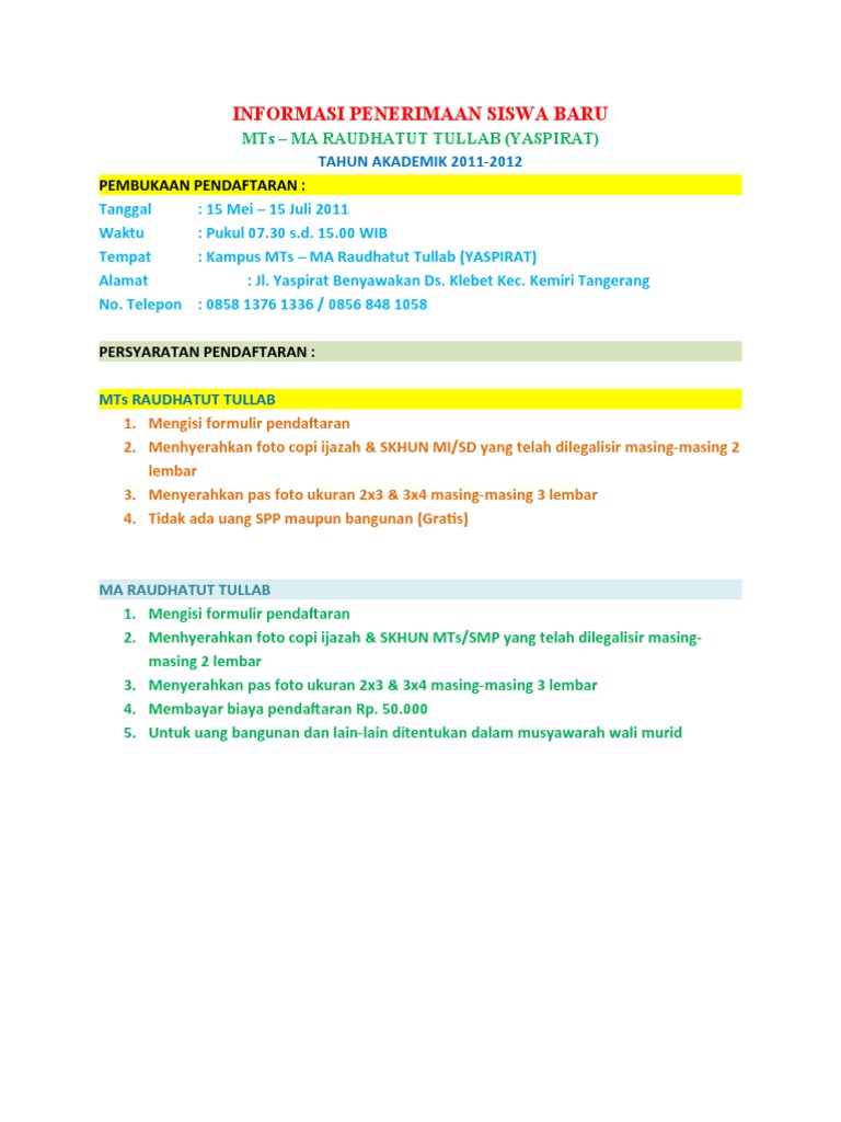 Penerimaan Siswa Baru Psb Tahun Pelajaran 2012 2013 Mts