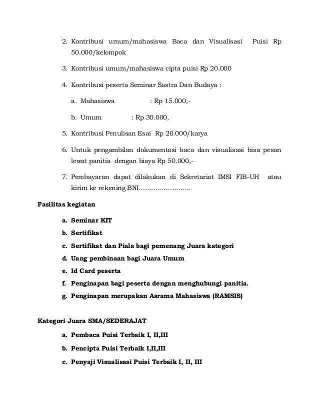 Untuk peserta yang berada di luar diy jawa tengah silahkan baca postingan ini klik disini 3. Contoh formulir pendaftaran siswa baru kalo tadi formulir pendaftaran lomba kalo contoh di sub bahasan ini yaitu formulir formulir pendaftaran siswa baru masih ingat betul saat dulu akan masuk sebagai siswa baru untuk masuk ke jenjang selanjutnya pada saat pendaftaran disuguhkan beberapa formulir pendaftaran. Persyaratan lomba bisa juga dikirim melaui pos ke sekretariat bersama keluarga mahasiswa sastra indonesia fakultas ilmu budaya universitas gadjah mada jalan sosiohumaniora bulaksumur yogyakarta.