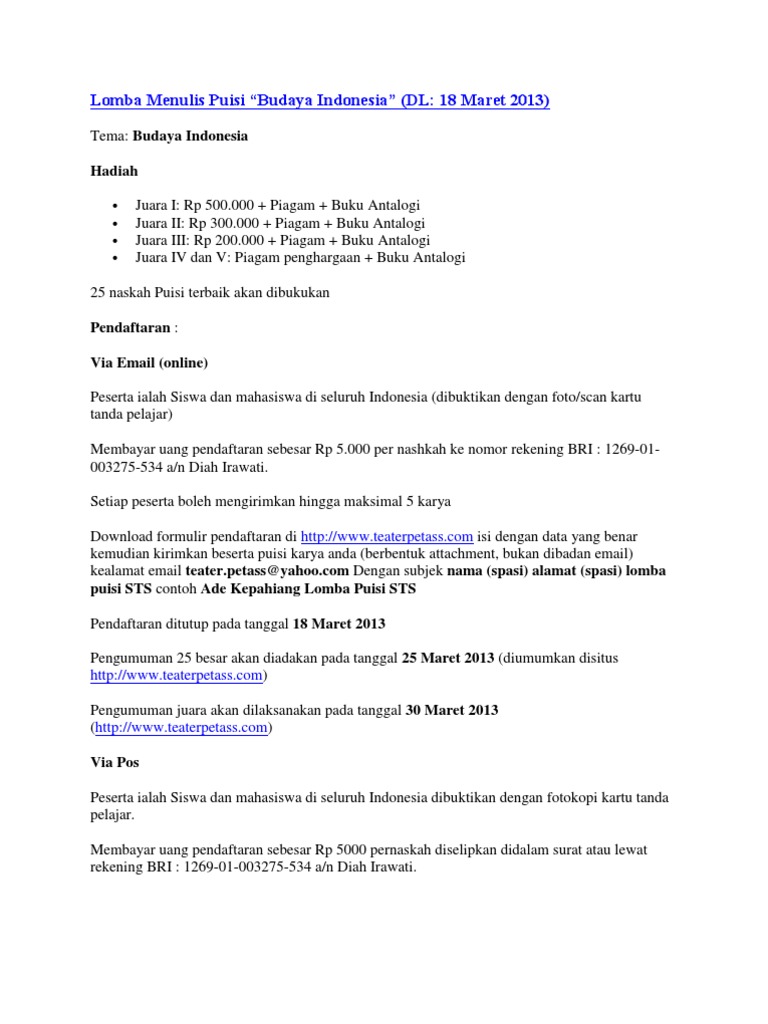 Lomba baca puisi umumnama peserta contoh. Kategori peserta adalah umummahasiswa dan pelajar. Lomba cipta puisinur romadani 5.